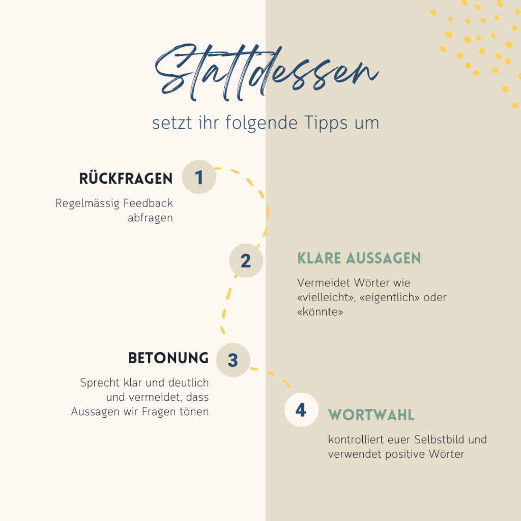 Hilfreich ist hier, klare Aussagen zu treffen. Kommt auf den Punkt und redet nicht um den heissen Brei. Vermeidet Wörter wie «vielleicht», «eigentlich» oder «könnte» und betont Aussagen nicht, als würdet ihr eine Frage stellen.