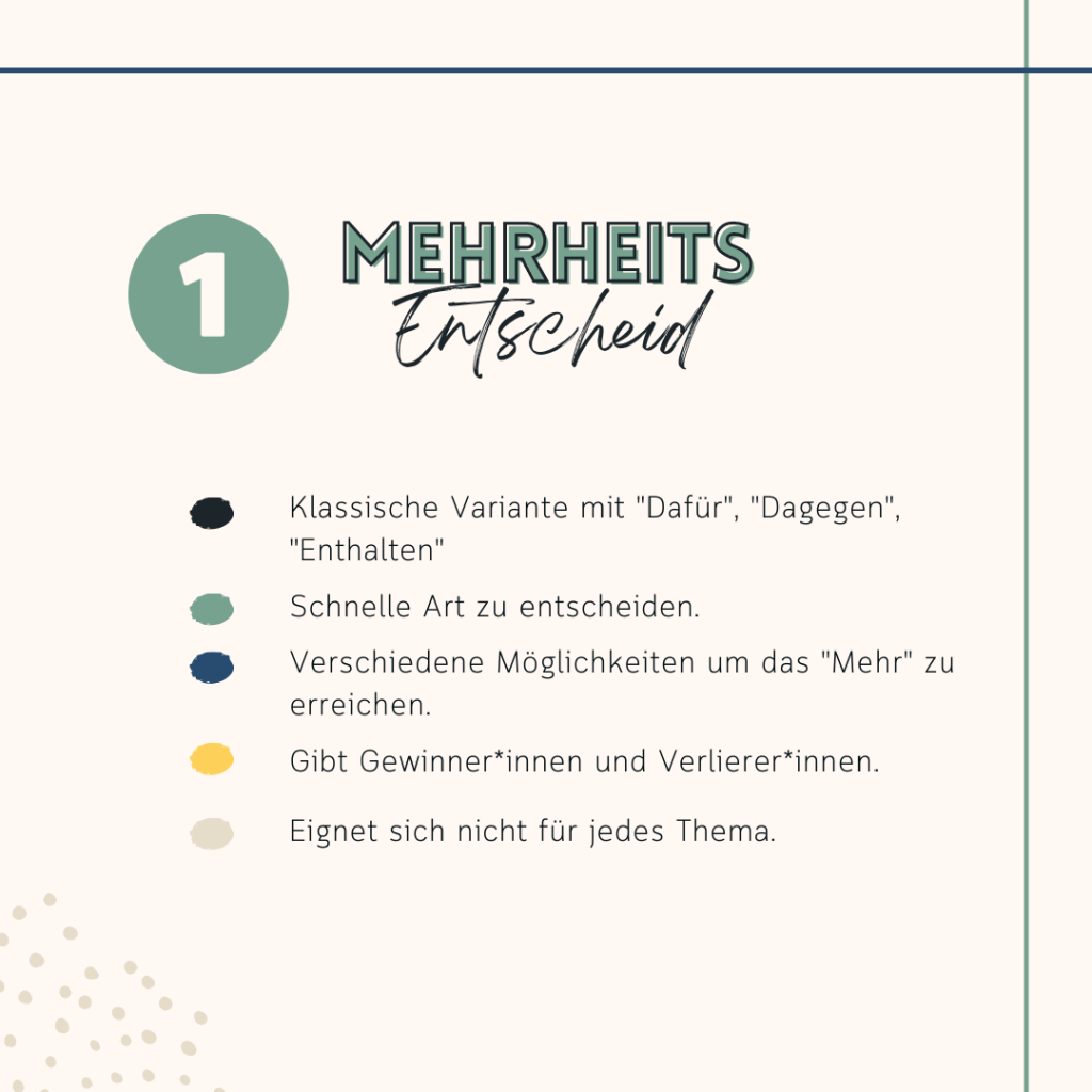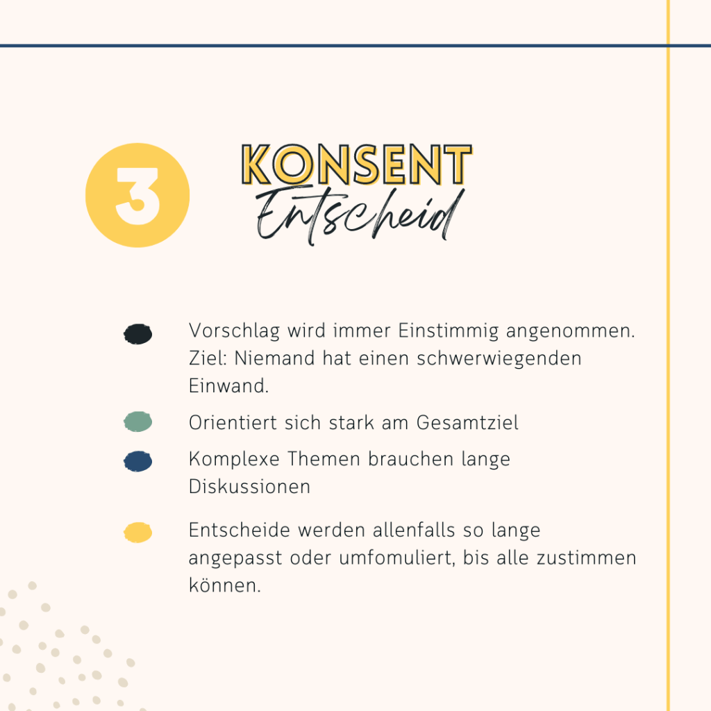 Wenn dann die Vorbereitungen soweit abgeschlossen sind, um einen Entscheid zu treffen, habt ihr verschiedene Möglichkeiten, wie ihr zum Ziel kommt. Es gibt grundsätzlich 3 Arten von Entscheidungen: